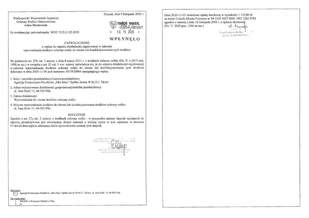 Sprzedający posiada zaświadczenie o wpisie do rejestru działalności regulowanej w zakresie wprowadzania środków ochrony roślin do obrotu lub konfekcjonowania tych środków nr 30/19/20964 z dnia 2020-11-06
